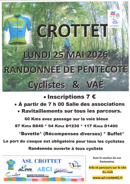 Malgré une météo capricieuse toute la semaine, la randonnée du lundi de Pentecôte a été un succès pour l'ASL CROTTET. Merci à toutes et à tous pour votre participation. Avec 317 inscrits, dont 30 en VAE, nous pensons que le parcours de retour par la voie bleue a été grandement apprécié.